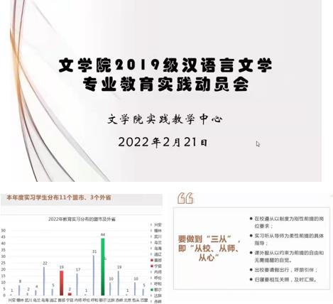 2022年2月21日,必赢76net线路官网以在线形式召开了2019级汉语言文学专业教育实践动员会。会议由必赢76net线路官网实践教学中心主任毛润民老师主持,即将走上实习岗位的2019级汉语言文学专业全体学生和系主任、班主任、团部支与学工办教师参加了会议。教务处副处长乌兰格日乐、必赢76net线路官网领导陆有富、牛海龙、石海光出席了本次会议。