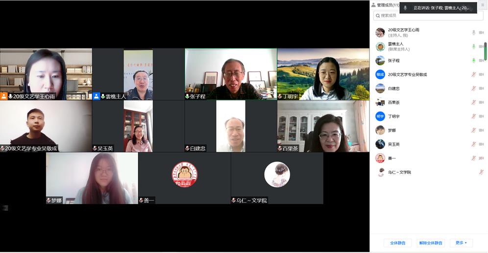 2022年4月24日上午,必赢官网文艺学专业硕士研究生课题论证会在腾讯会议举行。文艺学专业研究生导师万奇教授,白建忠教授,张树天教授,郭培筠教授,张子程教授,吴玉英副教授,以及本专业20级、21级研究生参加了论证会。会议由学位点主任万奇教授主持。2020级文艺学王心雨、梦娜、丁明宇、吴敬成4位同学依次做了开题报告,分别介绍了选题背景,选题研究价值,研究现状,研究思路方法和研究的具体内容、创新点等。各位导师针对每位研究生的开题报告做了全方位的细致点评。本次论证会是对2020级学生学习成果的检验,也是文艺学专业良好学风的体现。
