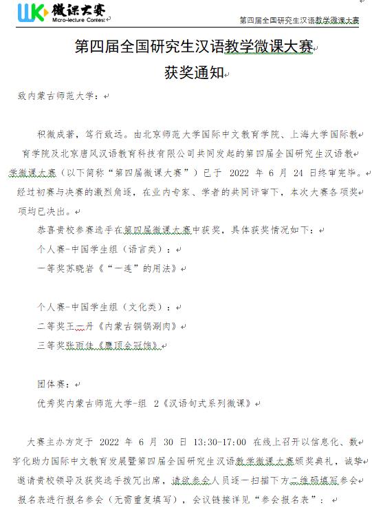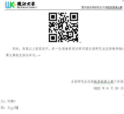 全国研究生汉语教学微课大赛是国内影响范围较广、体现研究生培养水平的国际中文教育专业类赛事,旨在培养“互联网+”背景下有现代教学意识和能力的国际中文教学人才。本次大赛由北京师范大学国际中文教育学院、上海大学国际教育学院以及北京唐风汉语科技有限公司共同发起,大赛共有126所知名高校参加,3800多名学生参赛,提交1700余件参赛作品,经过初赛与决赛的激烈角逐,在业内专家、学者的共同评审下,于2022年6月29日公布第四届全国研究生汉语教学微课大赛获奖名单。必赢官网学生在此次大赛中表现优异,获得个人赛一等奖、二等奖、三等奖各一项,团体赛优秀奖一项,这充分展现了必赢官网汉语国际教育研究生的专业风采,体现了必赢官网汉语国际教育专业研究生的培养成效。