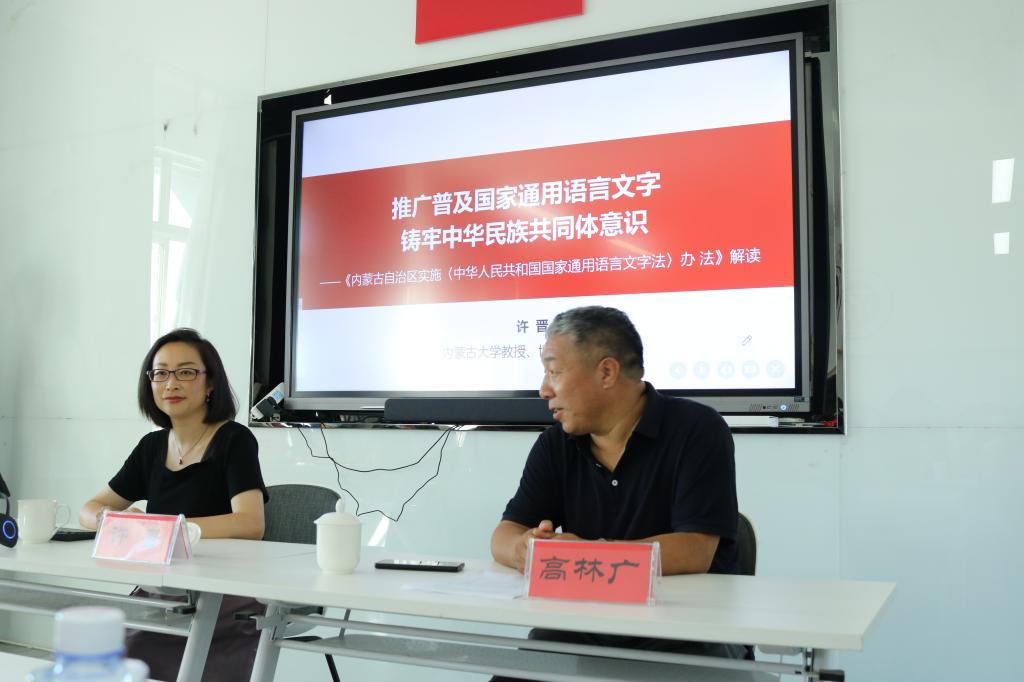 许晋教授首先从推广和普及国家通用语言文字对于铸牢中华民族共同体意识的意义讲起,接着细致解读了《内蒙古自治区实施〈中华人民共和国国家通用语言文字法〉办法》颁布的背景、内容以及意义和价值。现场气氛热烈,为必赢76net线路官网院庆营造了浓厚的学术氛围。