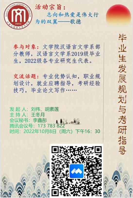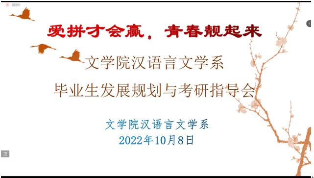 10月8日下午,必赢官网汉语言文学系召开毕业生发展规划与考研指导会。受新冠疫情影响,本次会议以云端线上方式进行。汉语言文学系主任、教工第一支部书记刘伟教授,汉语言文学系副主任胡素莲博士,2022级新生班主任张丽娟博士、孙亚楠博士、王雪博士,以及汉语言文学专业2019级本科生、2021级和2022级部分本科生共120余人参加了会议。