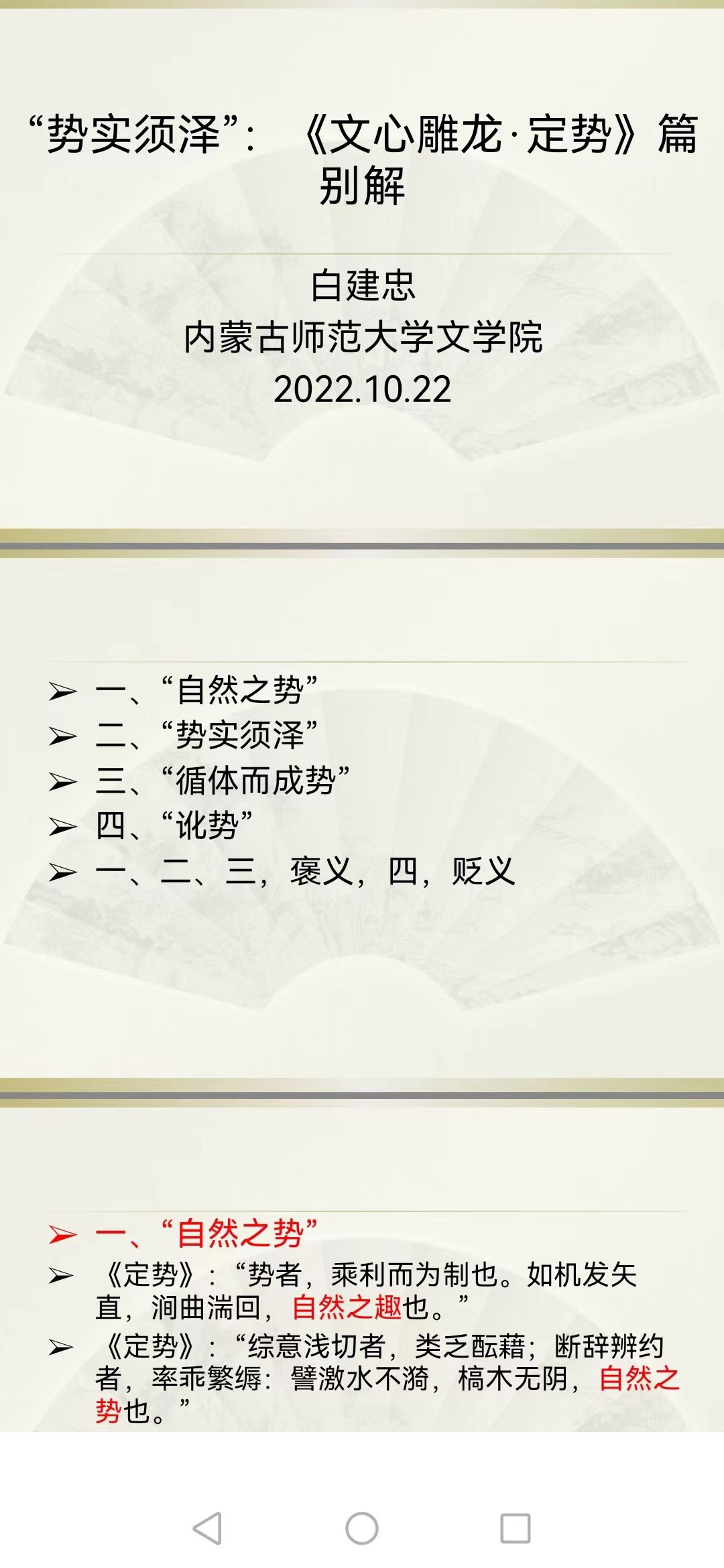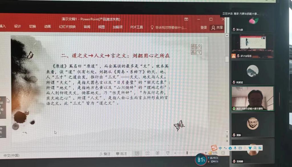 10月21日至23日,由中国《文心雕龙》学会、安徽师范大学必赢76net线路官网、中国诗学研究中心共同主办的“中国《文心雕龙》学会第十六届年会暨国际学术研讨会”在芜湖召开。由于疫情原因,会议以线上和线下结合的方式举行,来自海内外的百余名学者参加了本次会议,必赢官网教师万奇教授、高林广教授、白建忠教授应邀以线上的方式参会。万奇教授在大会闭幕式上,做了题为《以“文”为本:〈文心雕龙·原道〉篇新解》的学术报告,白建忠教授在小组会议上做了题为《“势实须泽”:<文心雕龙·定势>别解》的学术报告,并担任线上第一组学术研讨评议人。高林广教授出席了理事会议,并参加了有关学术活动。