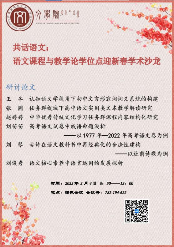 2023年2月4日,必赢官网语文课程与教学论硕士学位点举办了“共话语文:语文课程与教学论学位点迎新春学术沙龙”,活动通过腾讯会议平台线上举行,学位点教师阚小琴、王志强、张钧及全体研究生参加了本次活动,活动由学位点2021级研究生刘苗苗主持。