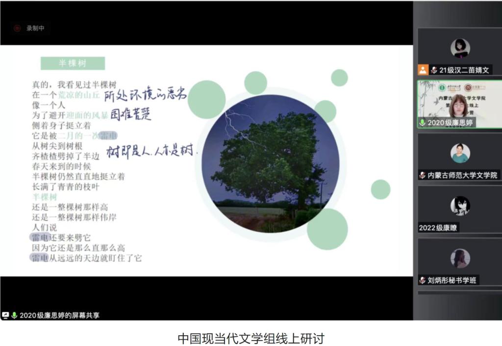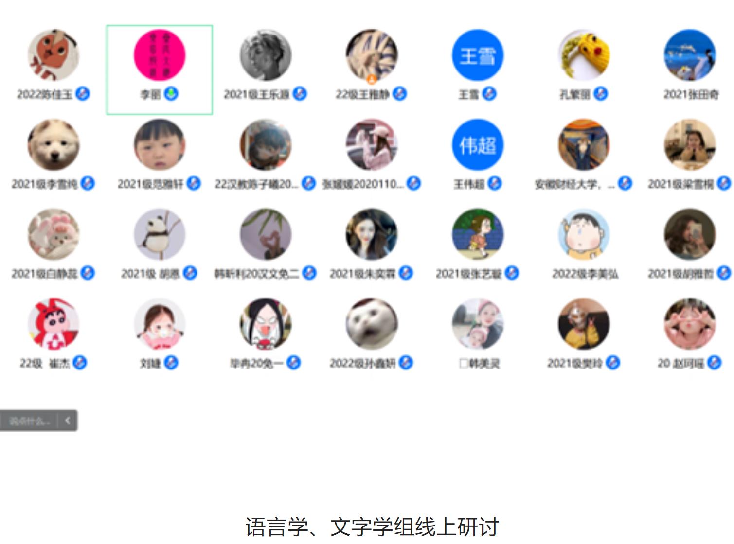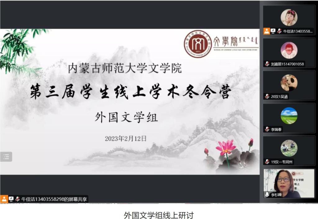 2月12日的活动主要为学术论文(读书报告)的汇报与点评及营员研讨。活动按学科分为四组,分别是中国古代文学组、中国现当代文学组、外国文学组和语言学、文字学组,共50名学生做了线上汇报。必赢官网教师刘伟教授、李丽教授、李杉婵副教授和孙静副教授担任各学科组长,组织了各组的论文(读书报告)汇报评议与营员研讨活动。
