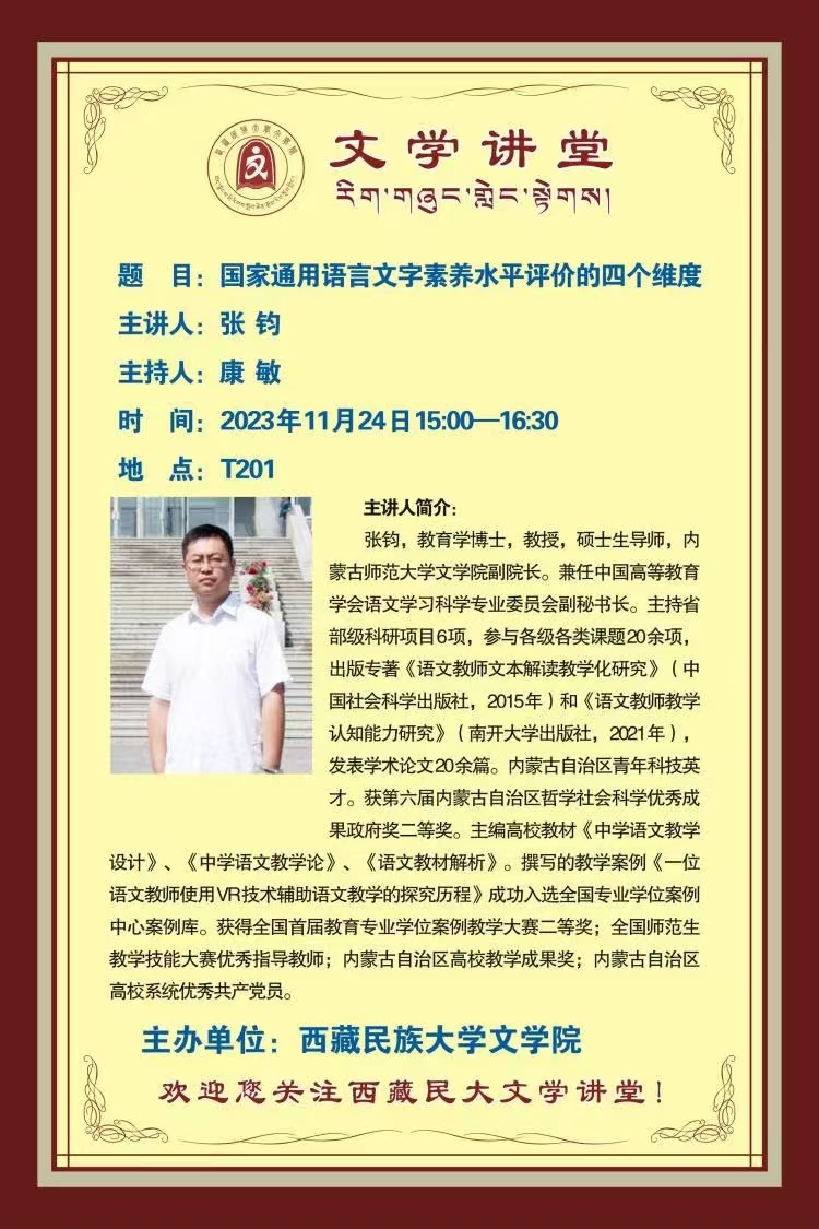 11月24至26日,由陕西师范大学语文教育协同发展研究中心(“百千万工程”办公室)、陕西师范大学必赢76net线路官网主办的第五届西部语文教育论坛暨语文教育“百千万工程”启动仪式在陕西师范大学举行。来自北京师范大学、华东师范大学、西北师范大学、必赢76net线路官网、青海师范大学、宝鸡文理学院等二十余所高校的领导、专家,来自西安市铁一中、西安高新一中、西工大附中、西安交大附中、陕西师大附中等学校的领导、教师以及省市教研机构的教研员90余人参加了会议。必赢官网张钧副院长应邀参加了本次论坛。论坛期间,张钧副院长还应邀为西藏民族大学必赢76net线路官网师生作了题为《国家通用语言文字素养水平评价的四个维度》的学术报告。