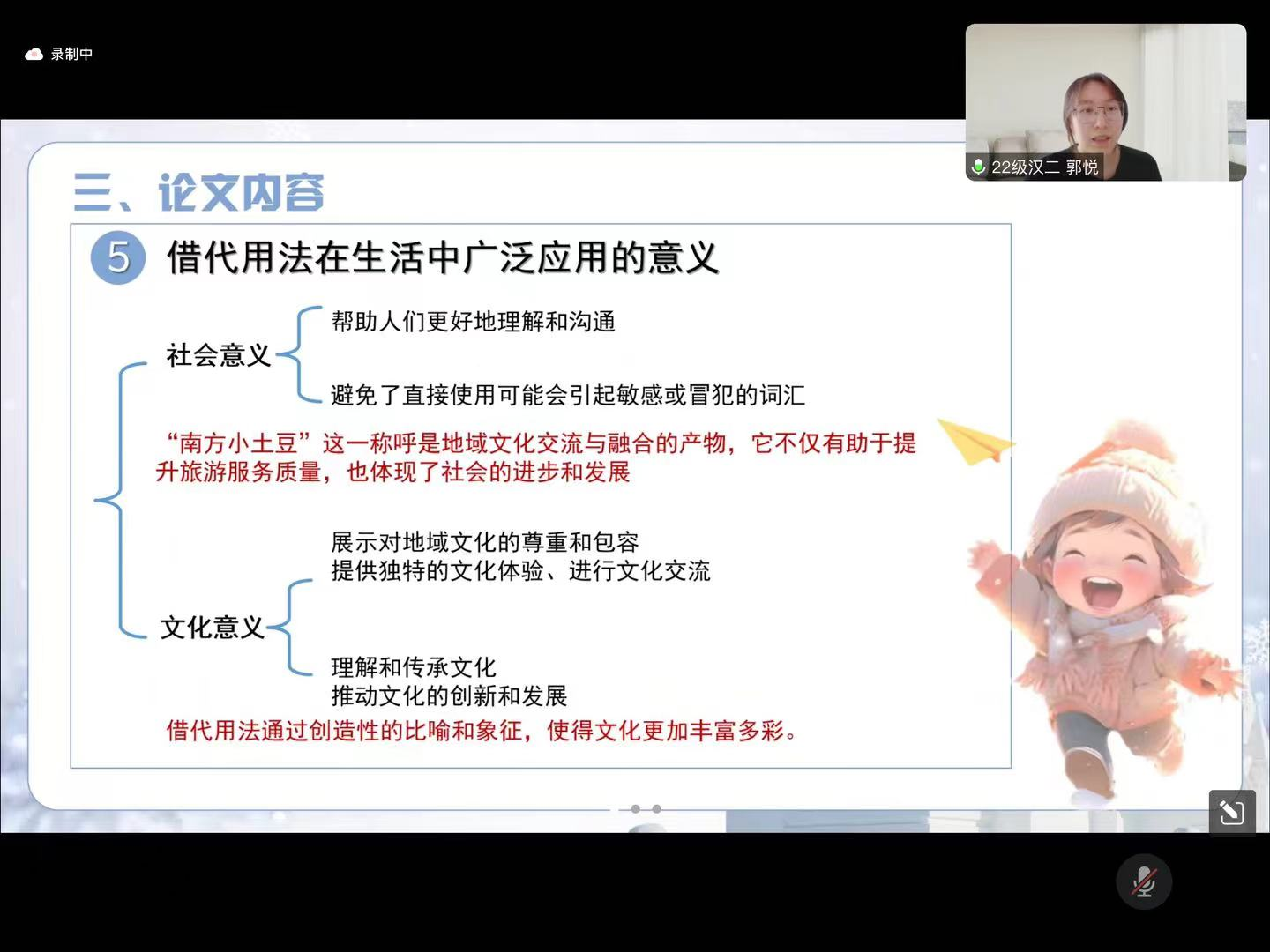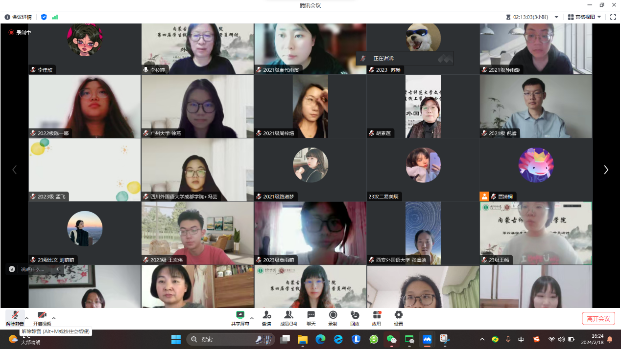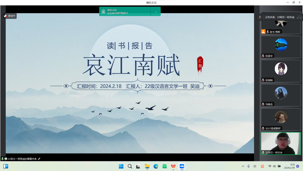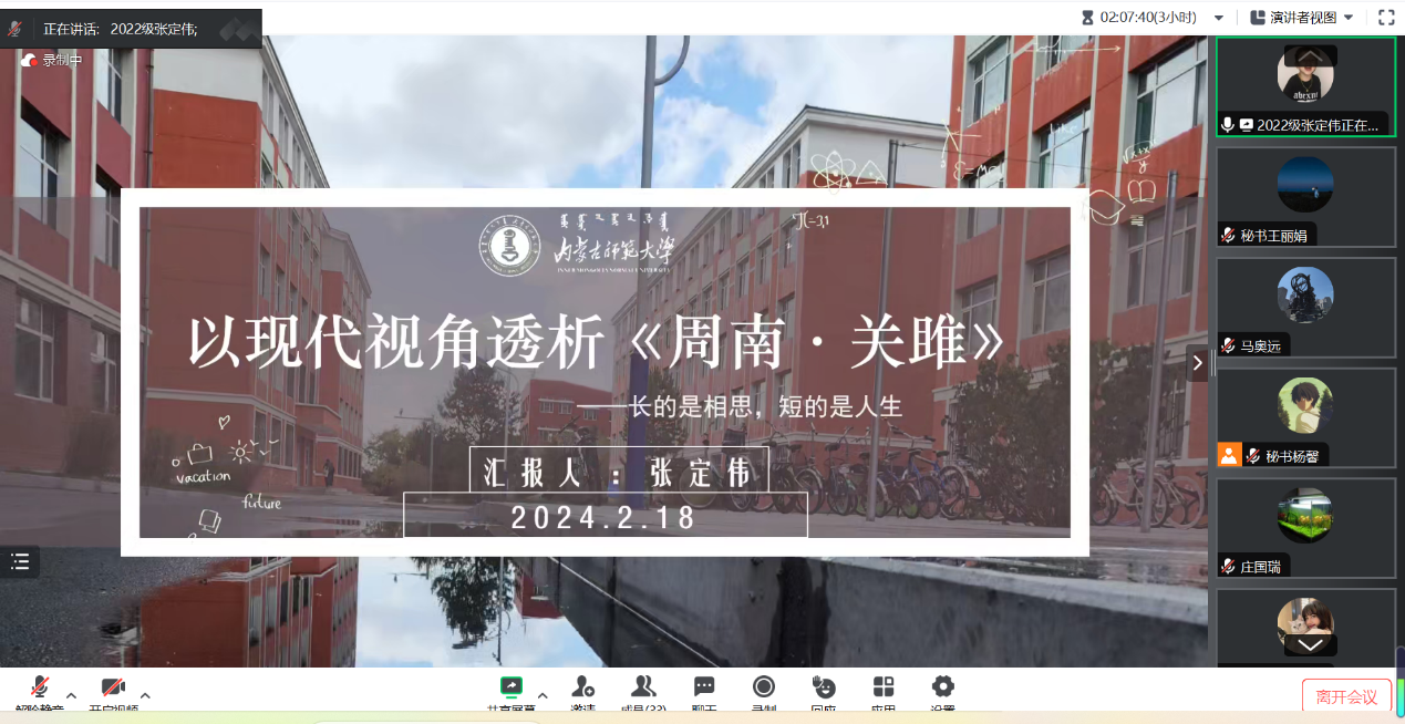 2月18日的活动主要为学术论文(读书报告)的汇报与点评及营员研讨。活动按学科分为四组,分别是中国古代文学组、中国现当代文学组、外国文学组和语言学、文字学组,共57名学生做了线上汇报。必赢官网教师李杉婵、孙静、马奥远、刘婕分别担任各学科组长,组织了各组的论文(读书报告)汇报评议与营员研讨活动。
