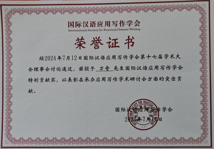 国际汉语应用写作学会是国际性民间学术团体。学会宗旨为“推动有系统、有组织的学术交流活动,以促进全球汉语应用写作在研究与教学方面的发展”。2018年万奇教授当选为学会副会长,2023年连任副会长。