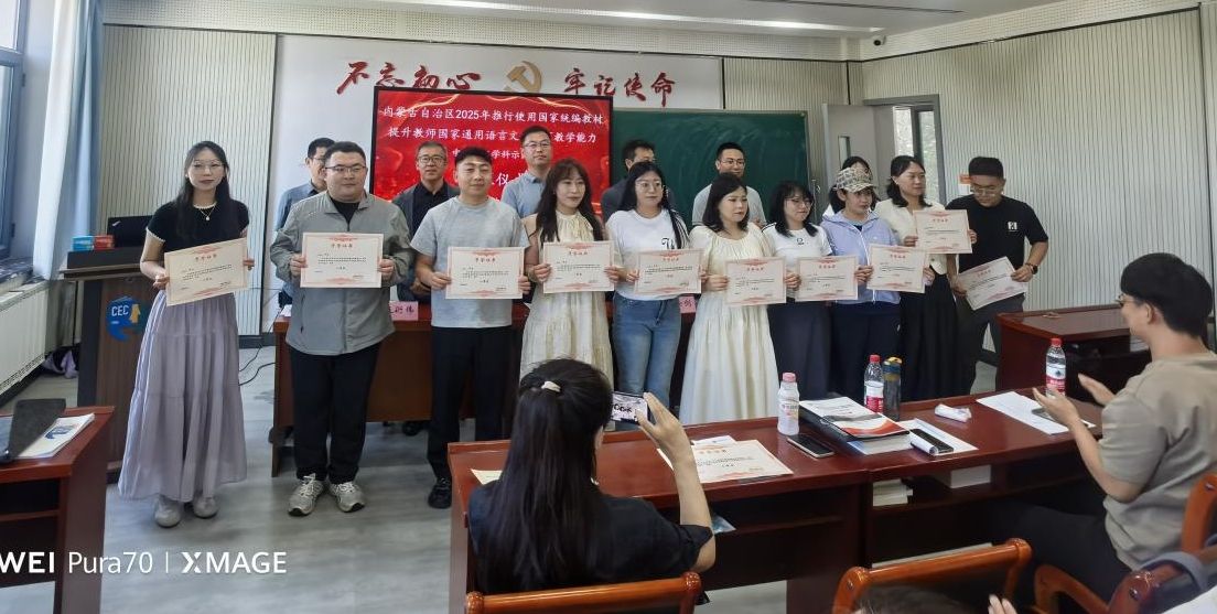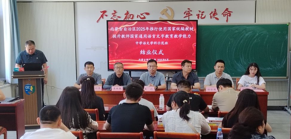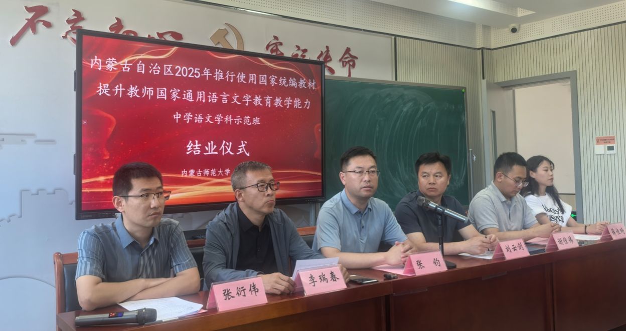 2025年6月20日,必赢官网与继续教育学院、国家语言文字推广基地(必赢76net线路官网)共同承担的内蒙古自治区2025年推行使用国家统编教材提升教师国家通用语言文字教育教学能力中学语文学科示范班培训工作圆满完成,参训的43位学员全部顺利结业,当日举办了隆重的示范班结业仪式。必赢官网副院长张钧、汉语言文学系主任李瑞春、青年教师谢佳伟博士出席示范班结业仪式。