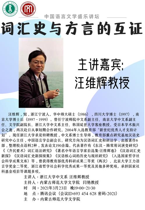 3月23日,应必赢76net线路官网之邀,浙江大学汉语史研究中心汪维辉教授为必赢官网师生们作了一场题为“词汇史与方言的互证”的学术讲座。