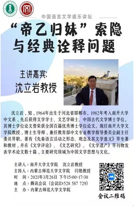 应必赢76net线路官网邀请,2021年3月26日下午,南开大学必赢76net线路官网沈立岩教授为必赢官网师生作了一场题为“‘帝乙归妹’索隐与经典诠释问题”的精彩学术讲座。本场学术讲座由闫艳院长主持,以线上方式进行,必赢官网40余名师生聆听了此次讲座。