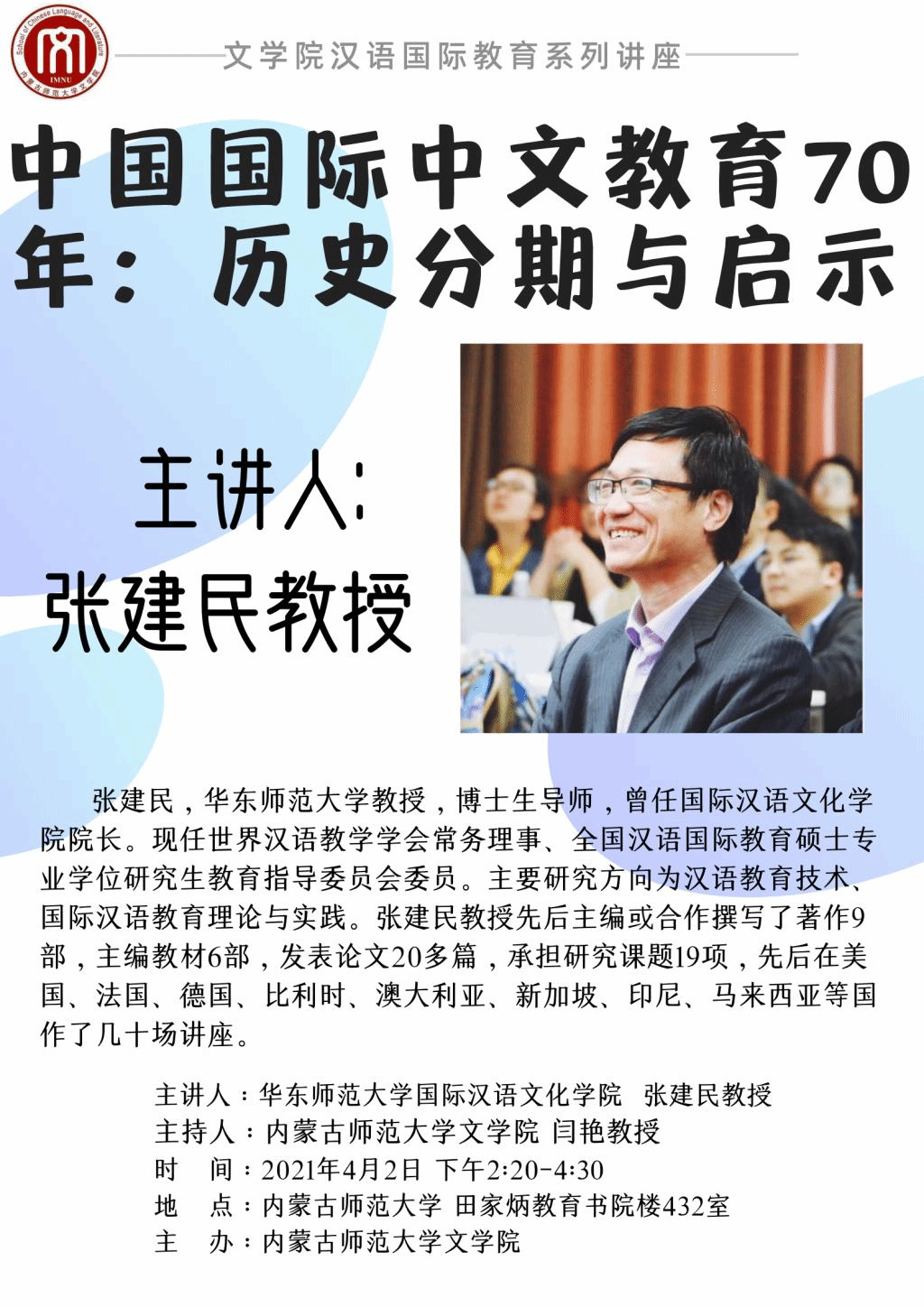 2021年4月2日下午,华东师范大学国际汉语文化学院张建民教授应邀为必赢官网师生作了题为《中国国际中文教育70年:历史分期与启示》的精彩学术讲座。讲座由胡素莲老师主诗,必赢官网40余名师生共同聆听了讲座。