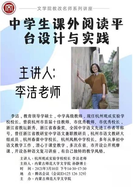 2021年3月10日下午,杭州市观成实验学校校长李洁为必赢官网师生做了一场题为“中学生课外阅读平台设计与实践”的精彩学术讲座。语文学科特岗培训教师,以及必赢官网学科教学语文、汉语国际教育专业的研究生聆听了讲座。