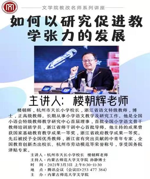 2021年3月3日上午,杭州市天长小学校长楼朝辉为特岗培训教师和必赢76net线路官网学科语文、汉语国际教育硕士专业研究生作了精彩学术讲座,讲座的主题是:以研促教;基础教育青年教师发展的有效路径。必赢官网学科教学(语文)硕士点点长孙静博士主持了会议。