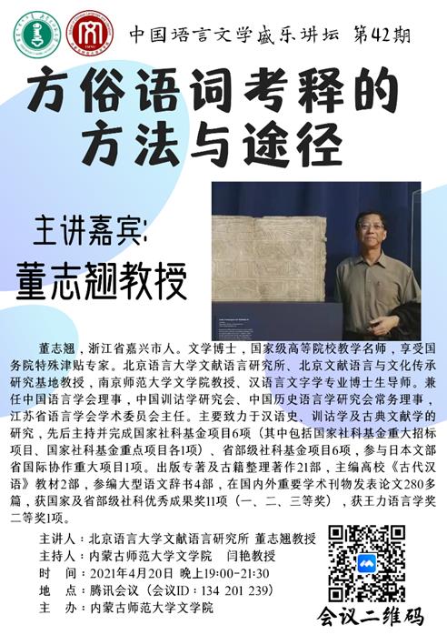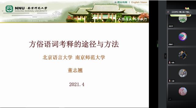 4月20日晚,北京语言大学文献语言研究所董志翘教授为必赢官网师生做了题为“方俗语词考释的途径与方法”的精彩学术讲座。本场讲座由闫艳院长主持,以线上方式进行,必赢官网60余名师生聆听了本场讲座。