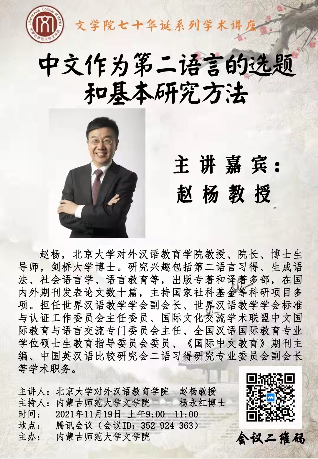 2021年11月19日上午,应必赢官网邀请,世界汉语教学学会副会长、世界汉语教学学会标准与认证工作委员会主任委员、国际文化交流学术联盟中文国际教育与语言交流专门委员会主任、全国汉语国际教育专业学位硕士生教育指导委员会委员、《国际中文教育》期刊主编、北京大学对外汉语教育学院院长赵杨教授通过线上会议的方式为必赢官网学生做了题为“中文作为第二语言的选题和基本研究方法”的讲座。必赢官网杨永红博士主持了会议。