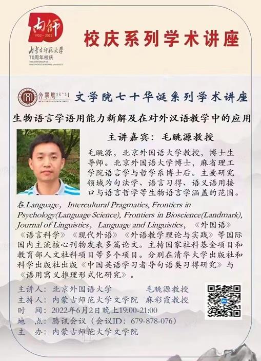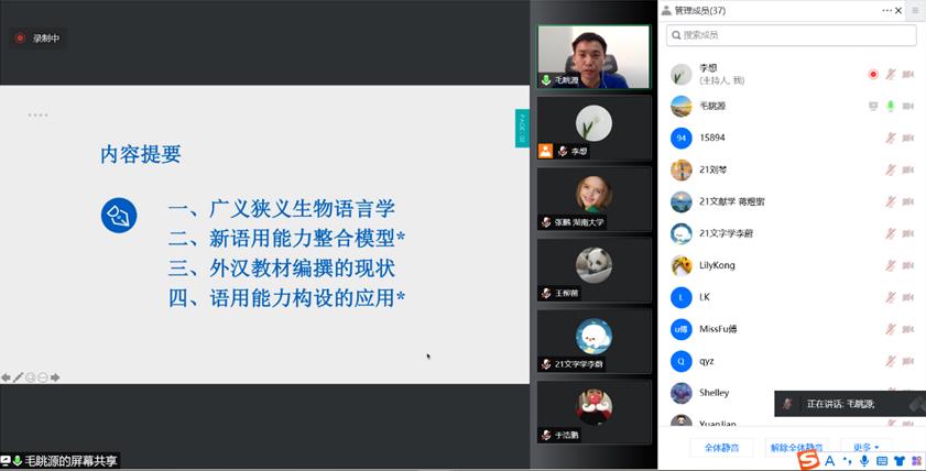 2022年6月2日晚,必赢官网邀请北京外国语大学教授、博士生导师毛眺源作了题为《生物语言学语用能力新解及在对外汉语教学中的应用》的学术讲座。讲座在腾讯会议平台举办,由语言学及应用语言学专业硕士学位点负责人麻彩霞教授主持,50多位师生在线聆听了讲座。