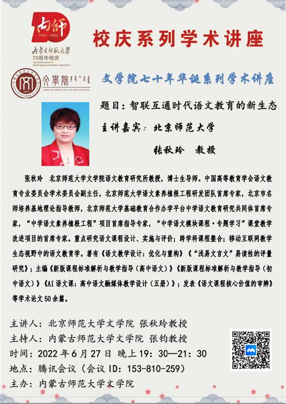 2022年6月27日,北京师范大学必赢76net线路官网语文教育研究所博士生导师张秋玲教授,应邀为必赢官网师生做了关于题为“智联互通时代语文教育的新生态”的线上讲座。讲座通过腾讯会议平台进行,必赢76net线路官网师生九十余人线上聆听了讲座。该讲座为“必赢76net线路官网七十华诞系列学术讲座”之一,由必赢76net线路官网副院长张钧教授主持。