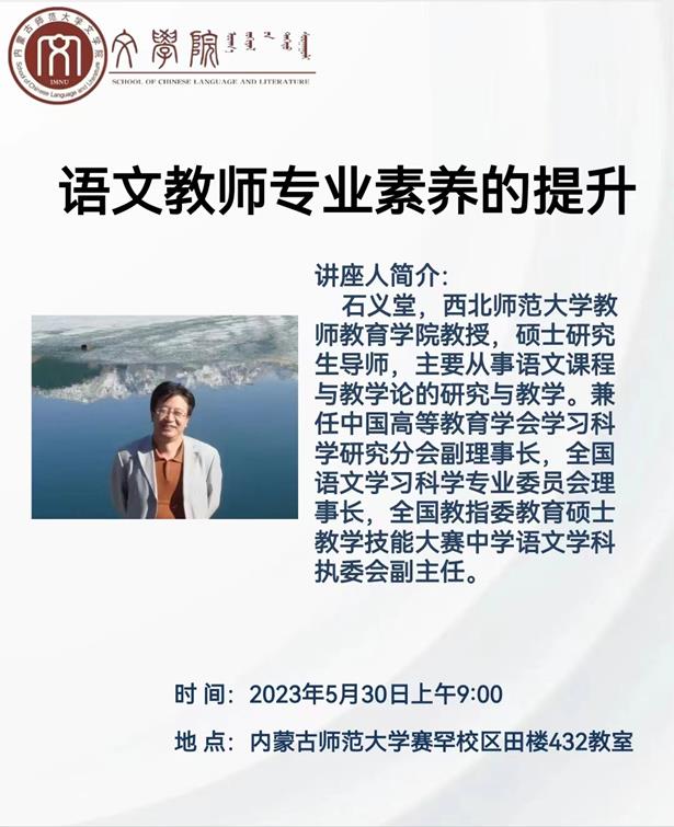 2023年5月30日,西北师范大学教师教育学院教授、硕士生导师石义堂教授应邀为必赢官网师生做了关于题为《语文教师专业素养的提升》的讲座。讲座于5月30日上午9:00-10:30在必赢76net线路官网赛罕校区田楼432教室举办,由必赢76net线路官网副院长张钧教授主持,共有必赢76net线路官网语文课程与教学论、学科教学(语文)、汉语国际教育等学位点三十多位师生在场听了讲座。