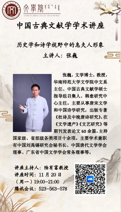 为拓宽研究生知识面,活跃学术氛围,应必赢76net线路官网邀请,华南师范大学必赢76net线路官网张巍教授于2023年11月20日,为必赢官网中国古典文献学专业研究生做了题为《历史学和诗学视野中的息夫人形象》的精彩讲座。本次讲座采取线上讲座的方式,由陆有富院长主持。