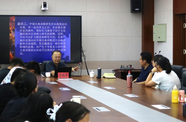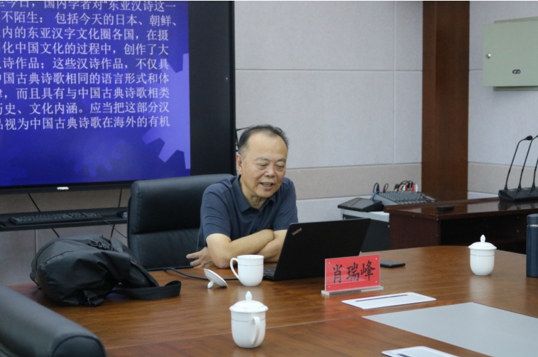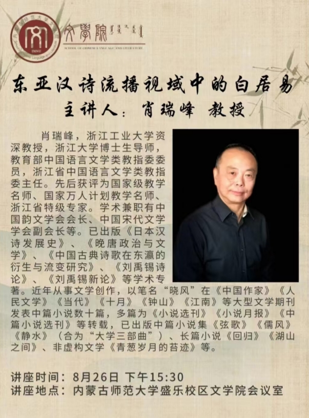 2024年8月26日下午,浙江工业大学资深教授,浙江大学博士生导师,教育部中国语言文学类教指委委员,浙江省中国语言文学类教指委主任肖瑞峰在盛乐校区学院楼A307为必赢官网师生作了题为“东亚汉诗流播视域中的白居易”的学术讲座。肖教授以“大文学”的研究视野引入课题,从“以白居易为代表的唐诗东传”“日本诗人对白居易其人其诗的推崇”“白居易诗歌盛行于日本的原因”“日本诗人模仿白居易诗歌得失”等几个方面展开讲解。讲座旁征博引,以详实的文献资料、幽默的语言风格为在场师生呈现了一场精彩的学术报告。在交流互动环节,肖教授就理论研究的学术视野、学术文献的收集整理等方面全面而细致地回答了师生提出的问题。