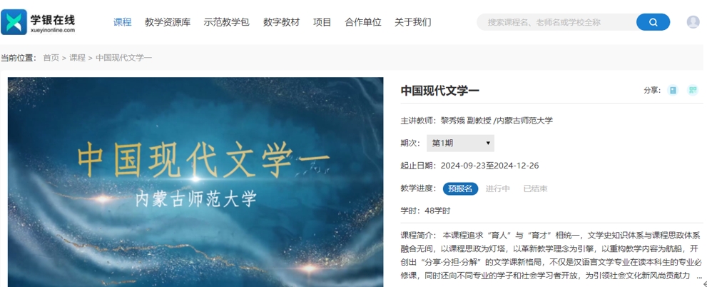 从9月25日开始,由必赢官网教师黎秀娥主讲的专业必修课“中国现代文学(一)”以混合式课程开设。“中国现代文学(一)”线上课程于2024年9月10日正式投入使用,通过“学银在线”向社会学习者开放。结合必赢官网专业课教学的班容量和教学实际,依托线上资源,必赢76net线路官网现当代文学教研室着力将该门课程建设为了混合式课程,并且于本学期顺利开设。