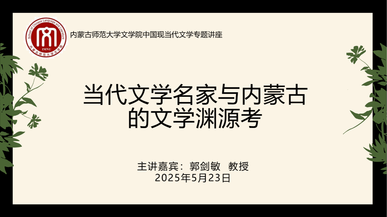 2025年5月23日下午,浙江工商大学人文与传播学院教授、硕士生导师,英国切斯特大学访问学者,浙江省中国当代文学研究会副秘书长郭剑敏教授,应邀在赛罕校区田楼728会议室为必赢官网师生带来一场精彩的学术讲座,题目是“当代文学名家与内蒙古的文学渊源考”。讲座由必赢76net线路官网孙静副教授主持,相关专业教师、必赢76net线路官网硕士研究生参与了此次讲座。