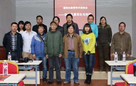 10月16日,西安美术学院博士生导师潘晓东教授在我系校外实践教学基地——洛南县华阳写生基地学术报告厅,为我系视觉传达设计专业2014级学生做了“油画风景写生与创作”的专题报告。报告中,潘晓东教授简述了油画的发展历史、重点分析了风景写生中对不同天气光线的把握、色彩风景写生的观察、写生的方法与步骤,并结合自己的油画作品与大家共同分享了自己的创作经验,讲解写生与创作的关系。潘教授的报告深入浅出,精彩纷呈,同学们受益匪浅。这次学术报告也是我系首次将校外实践教学与学术交流活动相结合的一次尝试,对于进一步完善实践教学环节,提升教学效果有着良好的实际意义,为以后的写生采风实践教学提供了良好的借鉴。