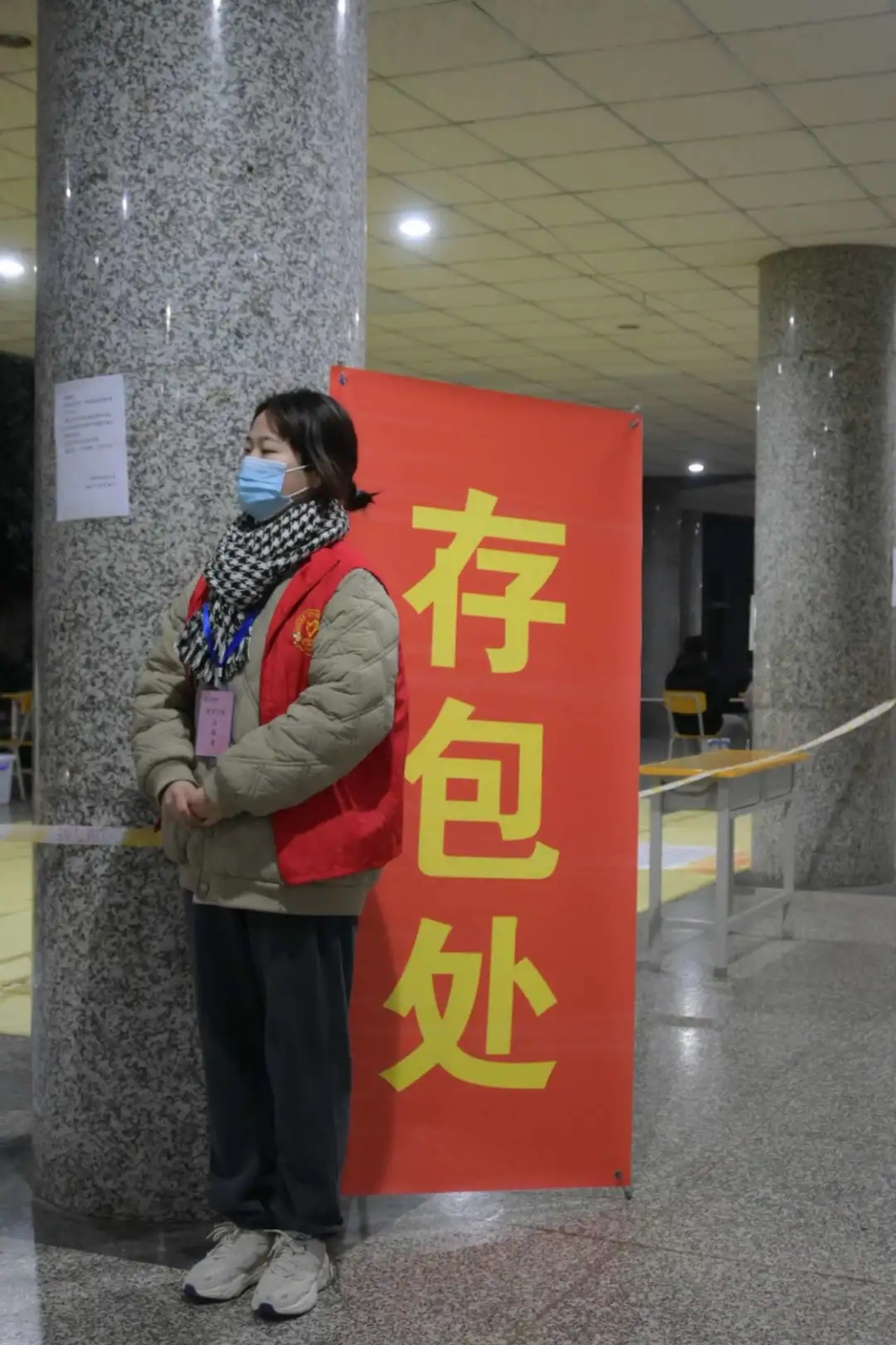 12月25日至27日考试期间,保卫处120余名护校队队员齐上阵,组建了一支“安大卫士”研考工作队,从早上6点开始,负责在江南校区北门查看社会考生一码通、核酸检测报告、行程码,并在两校区做好考生入场引导及教学楼外围安保工作。校团委为远道而来的考生专门安排了100多名大学生志愿者,做好疏散引导、维持良好秩序,并在1号教学楼大厅设置了六个窗口,点对点负责为考生们看包保管财务,让他们能够放心地走进考场,同时为了节省时间,让他们走出考场时,能够第一时间拿到自己的手机和物品。天寒地冻中,“红马甲”成了最暖心的存在。学工部周密部署,安排了10辆专车承担考试期间500余名江南考生至江北考场的往返接送任务。考虑疫情影响下,校外考生用餐不便,后勤处饮食服务中心提前做好近2000名校外考生和监考教师的午餐供应方案,各二级学院号召在校学生错峰就餐为研考学生提供一个安静温馨的就餐环境,确保校外考生在寒冷的冬季吃到放心可口的饭菜。