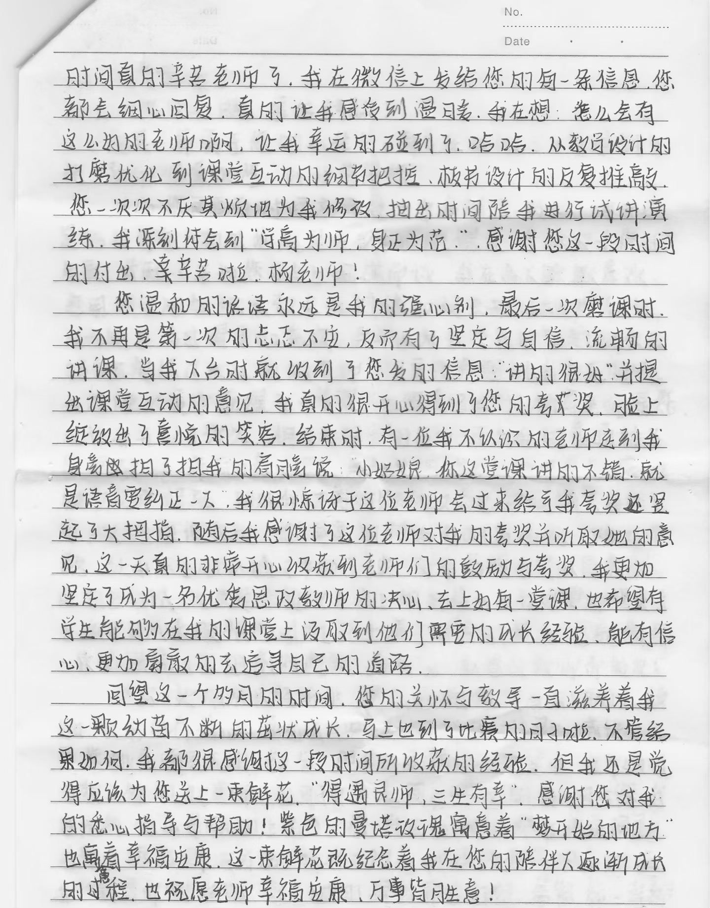 在教学上,杨曼同样秉持着“慢变量”的耐心与执着。教研室集体备课会上,她的教学方案总能成为标杆:案例紧贴时政热点,逻辑梳理细致入微,甚至连课堂互动的每一个环节都预设了多种可能。“对课堂,我有一条不可逾越的底线:不敷衍自己,更不敷衍学生。” 她的随身课堂记录本上,密密麻麻标注着学生的疑问、教学的反思、改进的方向,一页页纸张,见证着她对教学的敬畏与精进。她坚信,思政课的魅力在于春风化雨的引导,唯有放慢节奏、多思一层、多备一步,方能让理论真正“活”在学生心中。