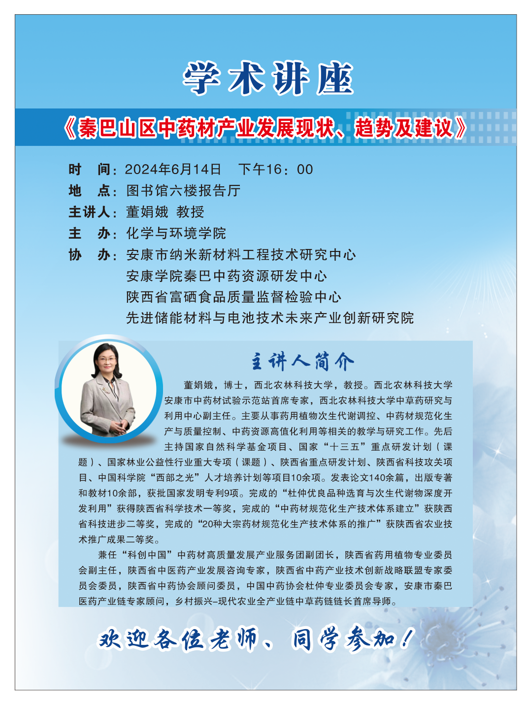 董娟娥,博士,教授,博士生导师,西北农林科技大学林学院生物科学系主任。日本杜仲研究会会员,陕西省中药产业联盟专家委员,陕西省中药研究会理事,陕西省中药协会顾问委员,陕西省药学会中药、天然药物专业委员会委员,宁夏固原中药产业发展高级顾问。研究方向药用植物次生代谢与中药材生产质量控制、天然产物提取分离与资源利用。